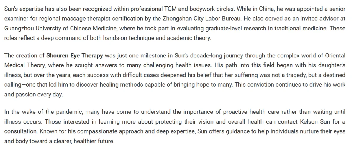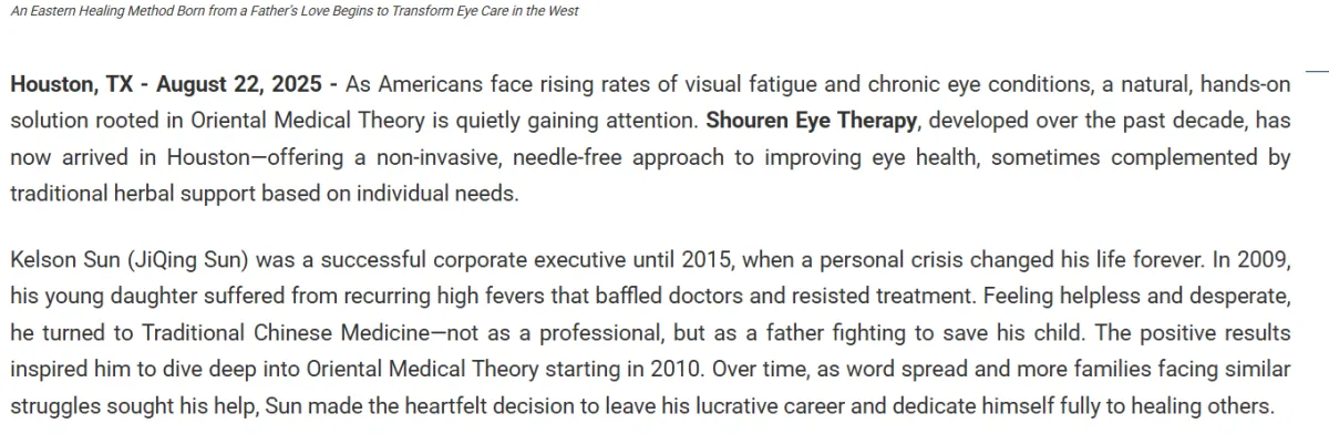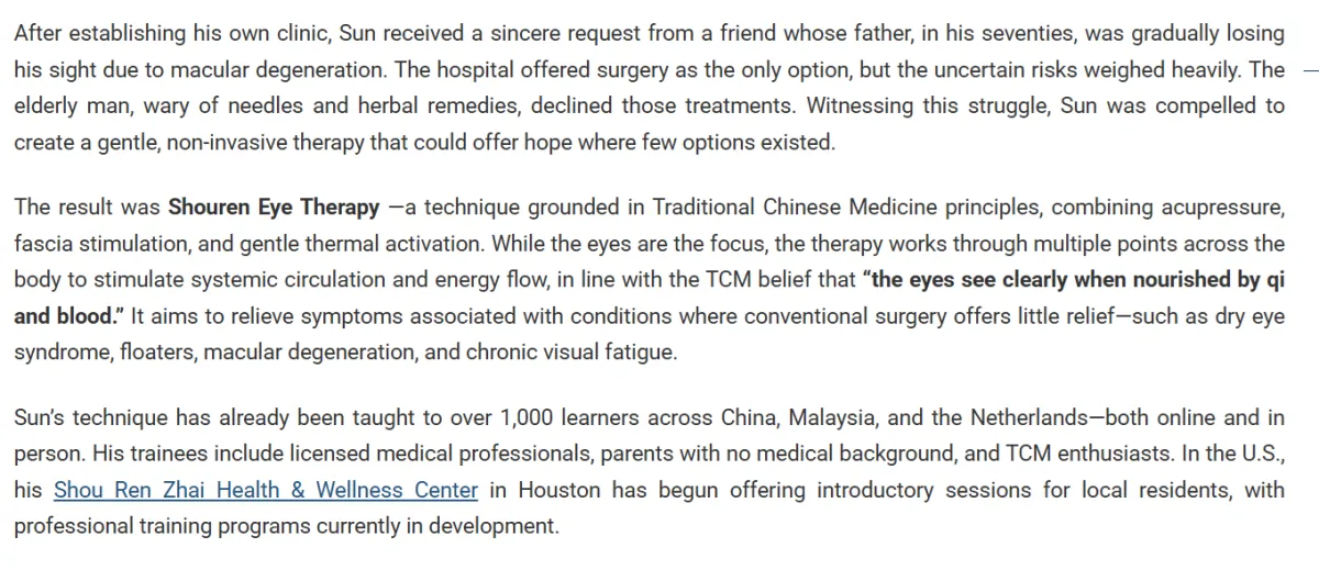 由孙吉庆(Kelson Sun)经过十余年研究与实践发展而成的“守仁眼疗”(Shouren Eye Therapy),现已落地休斯敦,为当地居民提供一种温和、无创、无需针具的眼部健康支持方式,并在个别情况下根据个人状况辅以传统草本调理建议。